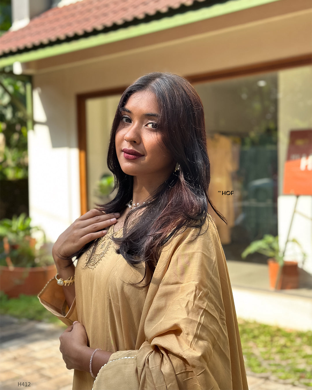 MY HOF LaunchingBeige Color Suit Set In Muslin fabric The top features a slitted design with a golden thread and sequin hand embroidery on the yoke and sleeves. It’s paired with a matching crepe dupatta detailed with golden lace.