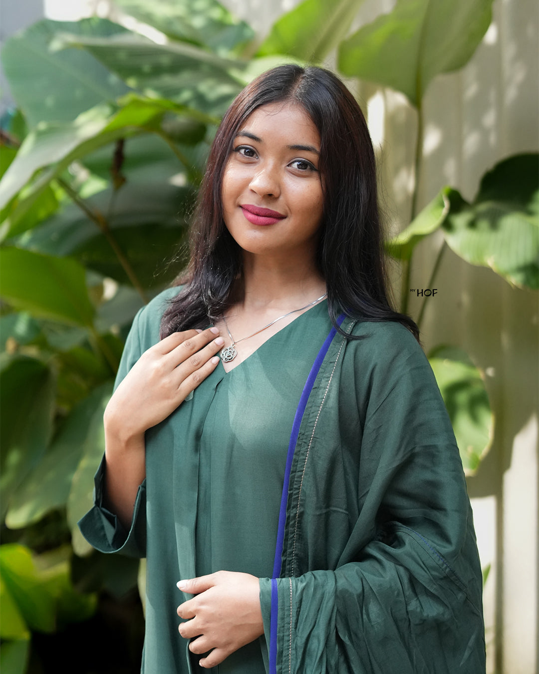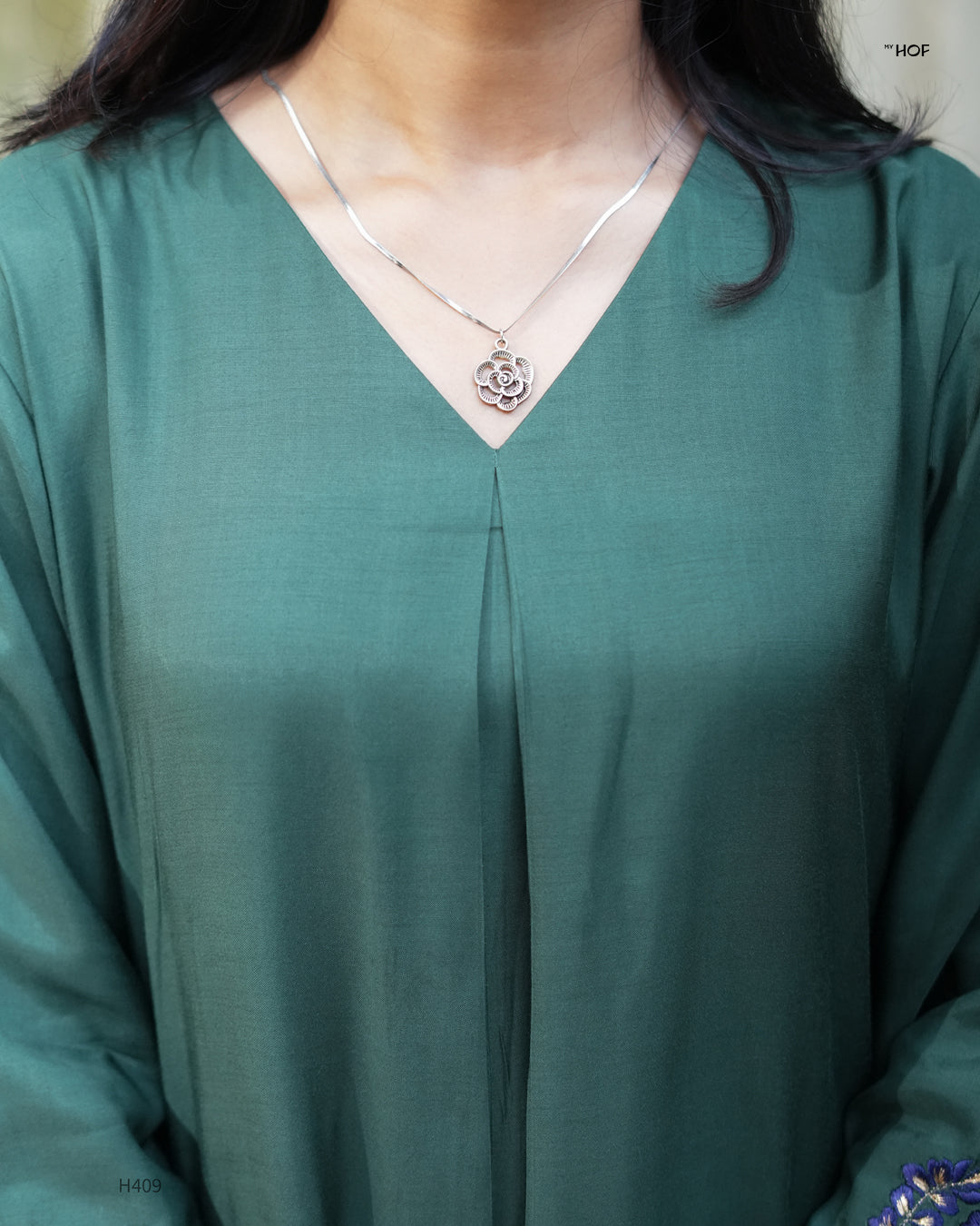 MY HOF Bottle Green suit set In Muslin. The top features a V-neckline with minimal pleat detailing in the front, while the sleeves are adorned with subtle floral embroidery in shades of blue and silver. The matching dupatta is enhanced with a contrasting royal blue border and fine silver threadwork.