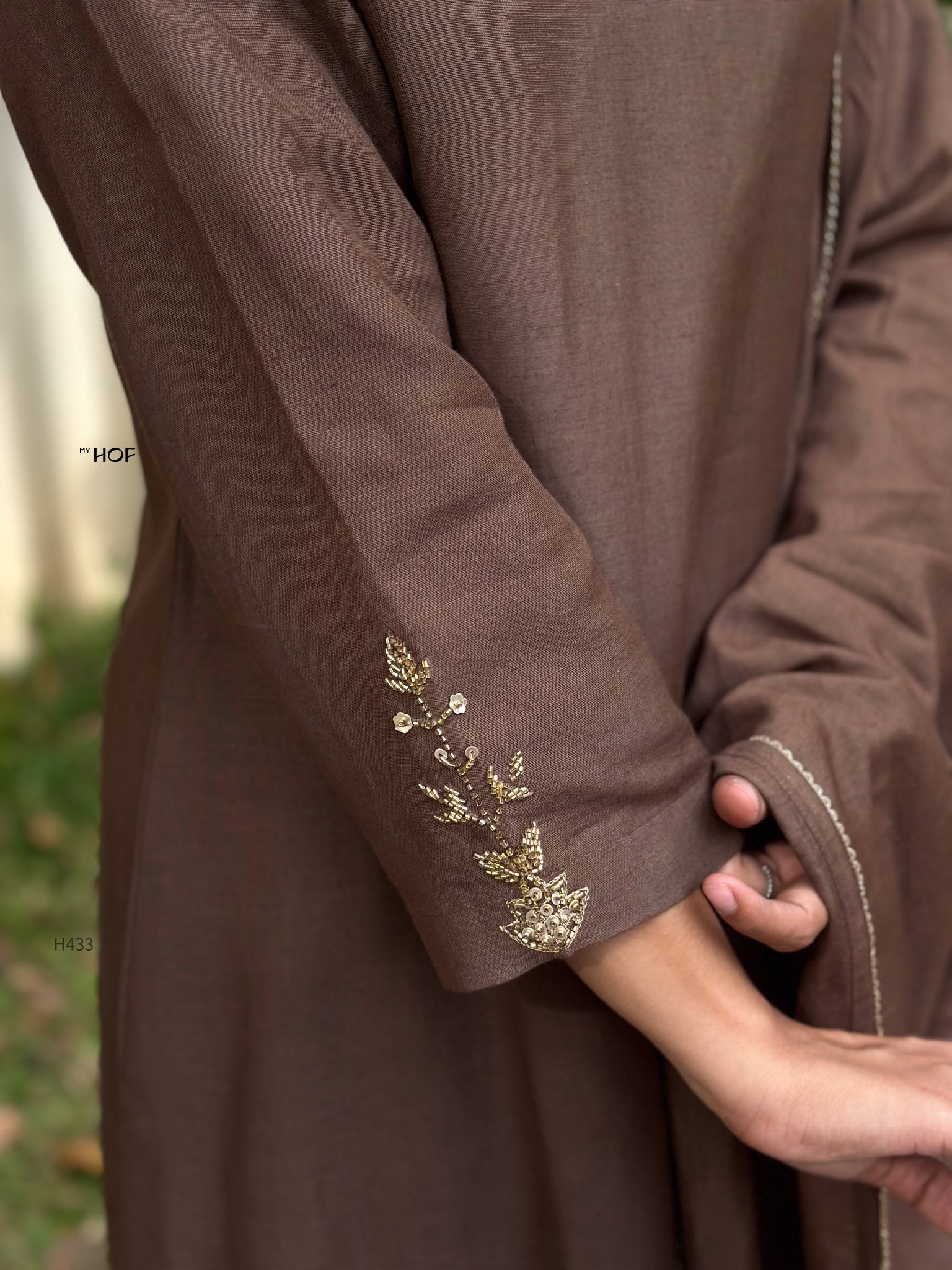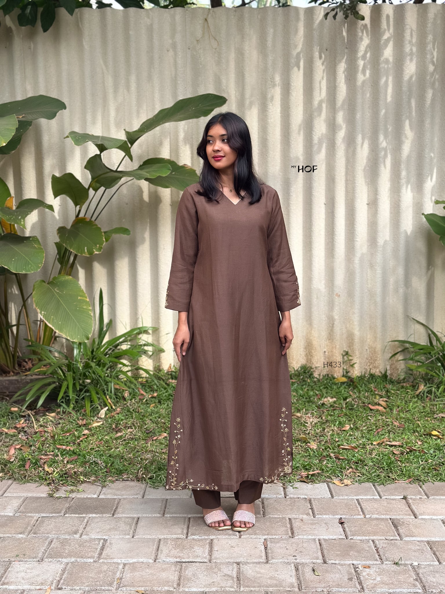 MY HOF Coffee Brown Suit Set With Floral Hand Embroidery In Linen