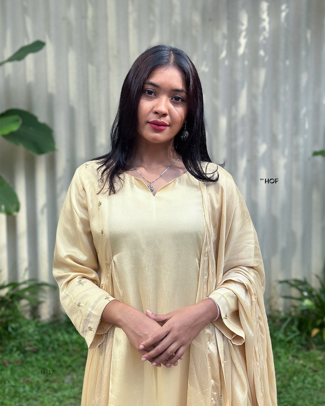MY HOF Launching Golden Beige Suit Set In Crepe and The top features a graceful V-neckline and straight-cut silhouette enhanced with subtle sequin and thread embroidery on the sleeves and front panel. The matching dupatta carries a soft sheen and delicate thread detailing.