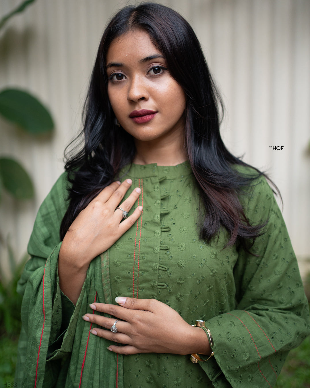 MY HOF is launching a leaf green suit set in premium Hakoba fabric, featuring a slitted top with elegant contrast red stitch detailing on the sleeves and yoke. It is paired with a soft cotton dupatta finished with matching red piping, creating a simple yet graceful ethnic look.