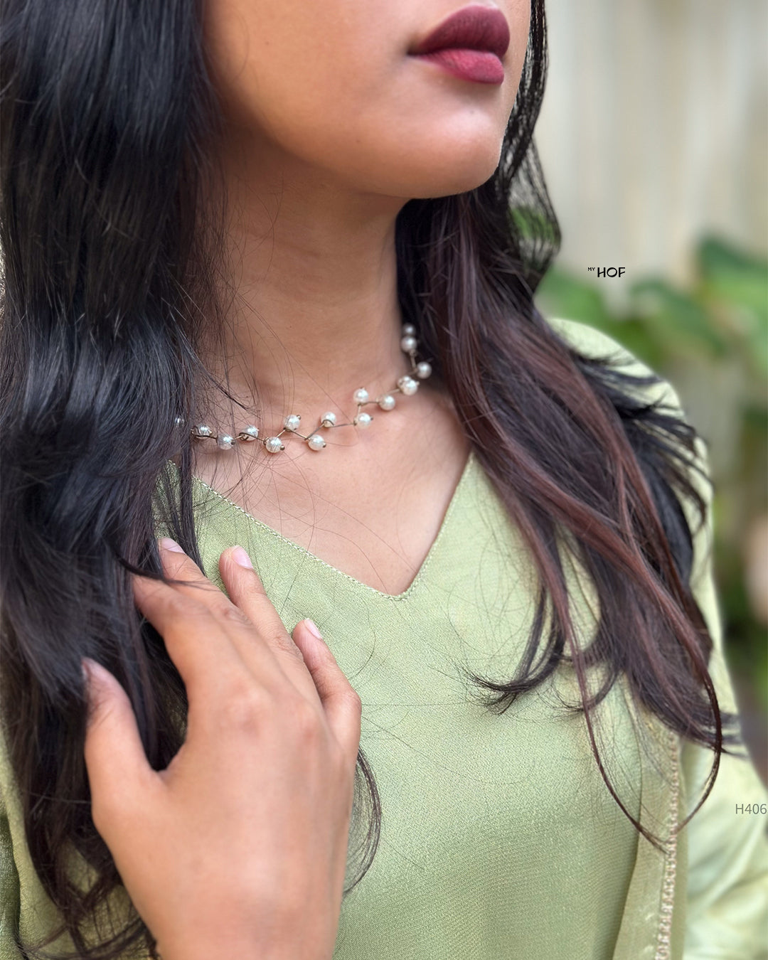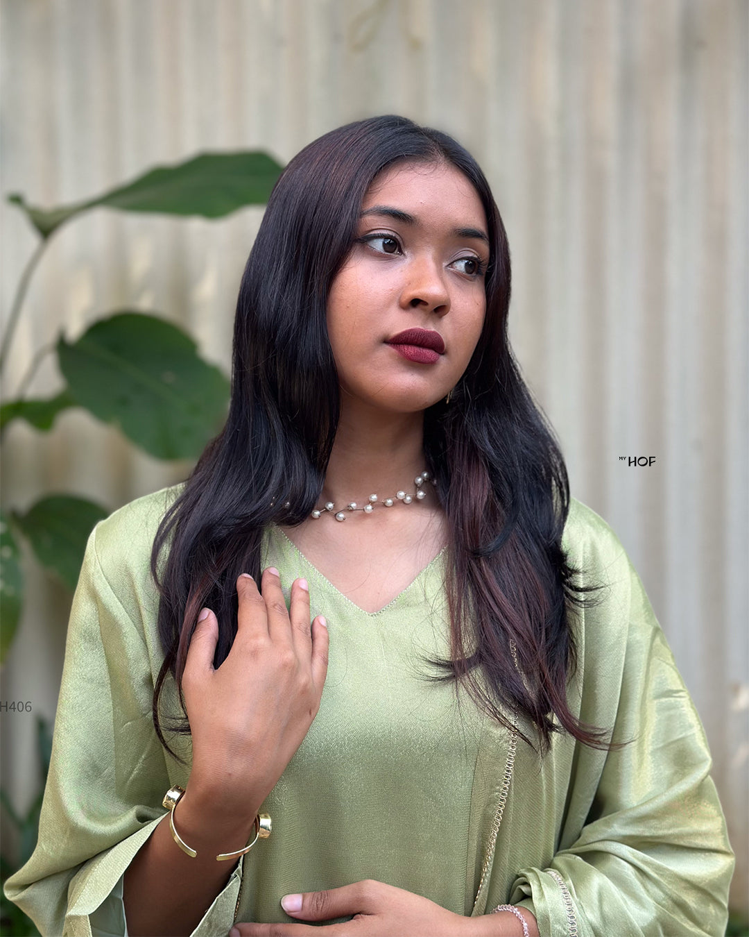 MY HOF is launching a light olive green suit set in crepe fabric, featuring a V-neck design with elegant golden thread work and sequin detailing on the top. The matching dupatta is adorned with golden lace work for a refined finish.