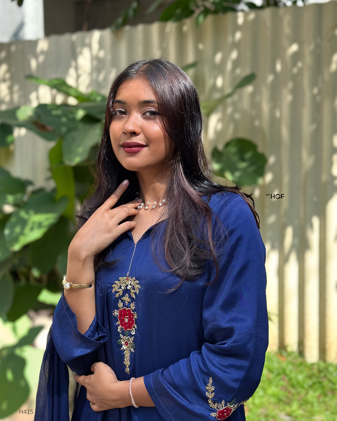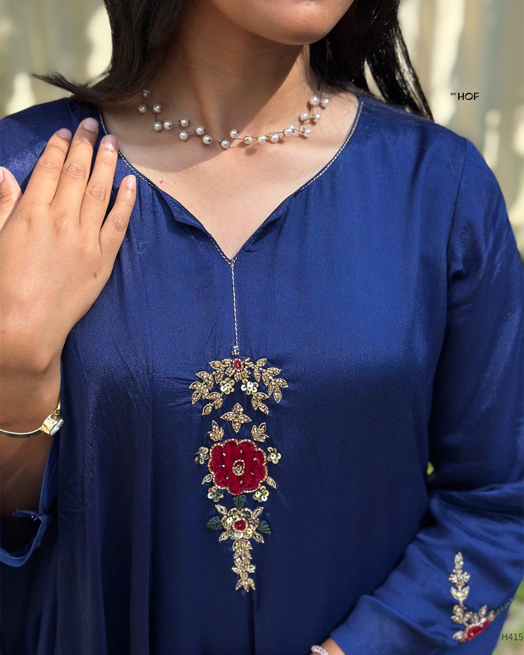 MY HOF Launching navy blue suit set in crepe and The slitted top features an elegant V-neck design with intricate floral hand embroidery in red and golden tones on the yoke and sleeves. It’s paired with a matching crepe dupatta.