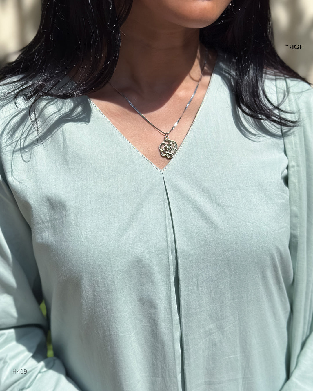 MY HOF Launching Ocean Green Suit Set In Cotton And The top features a Slitted asymmetrical hemline with a V-neck design and pleated detailing at the front. It is beautifully highlighted with delicate thread embroidery and floral motifs near the hem. The set is paired with straight cotton pants and a matching lightweight dupatta.