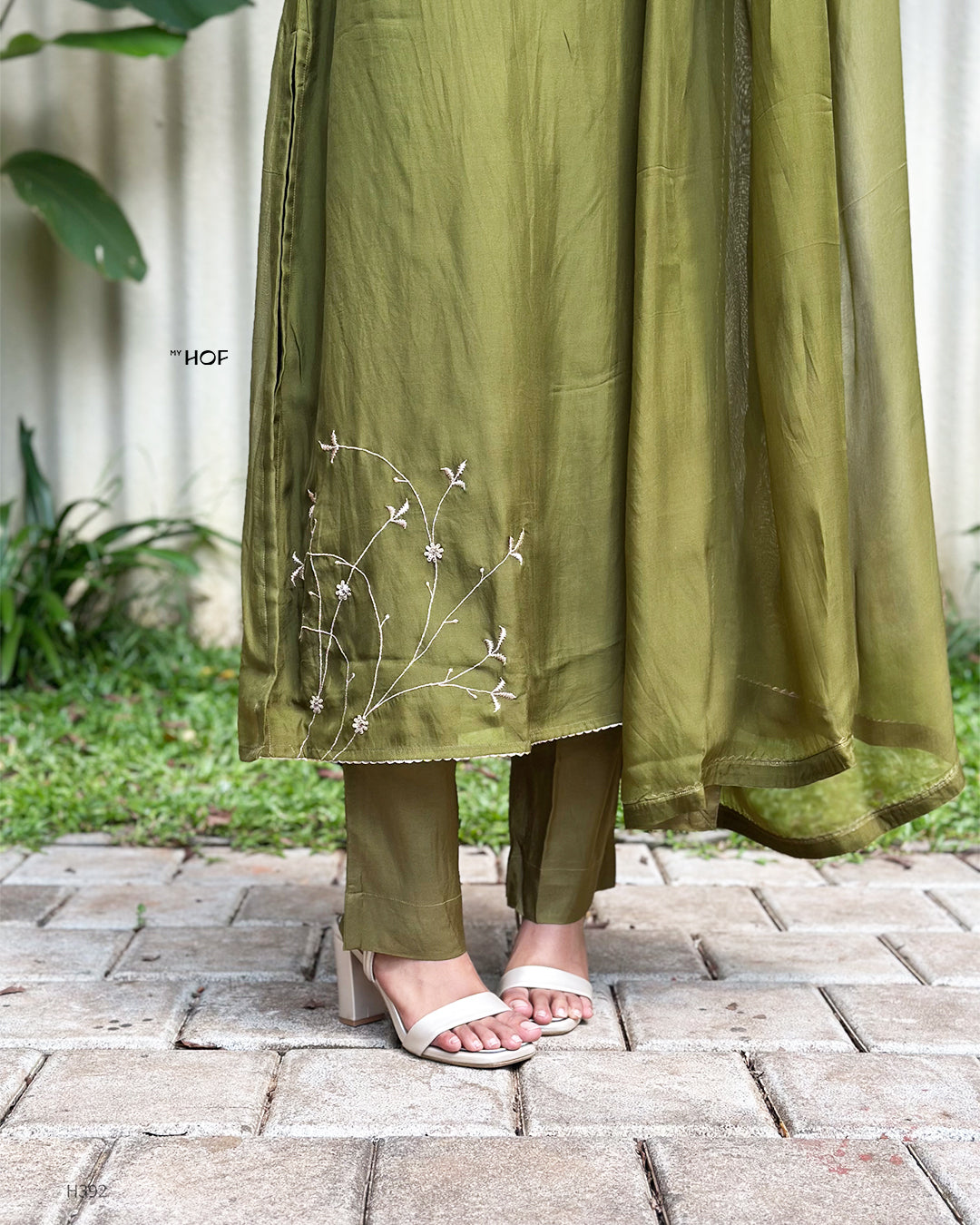 MY HOF Launching The olive green suit set in Organza. It features delicate floral thread embroidery on the sleeves and hem, enhanced with fabric buttons along the front for a graceful touch. The matching dupatta is detailed with fine lace details