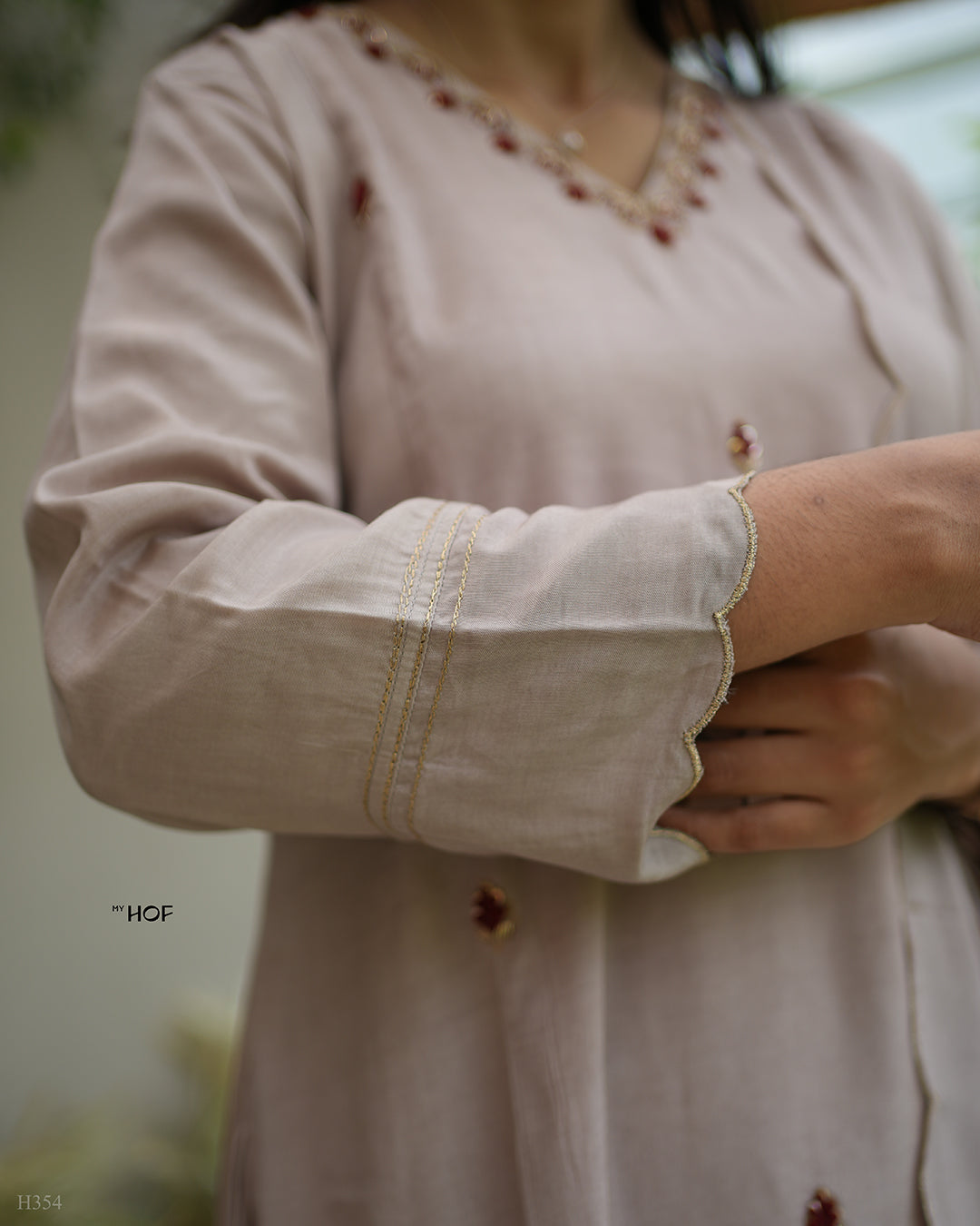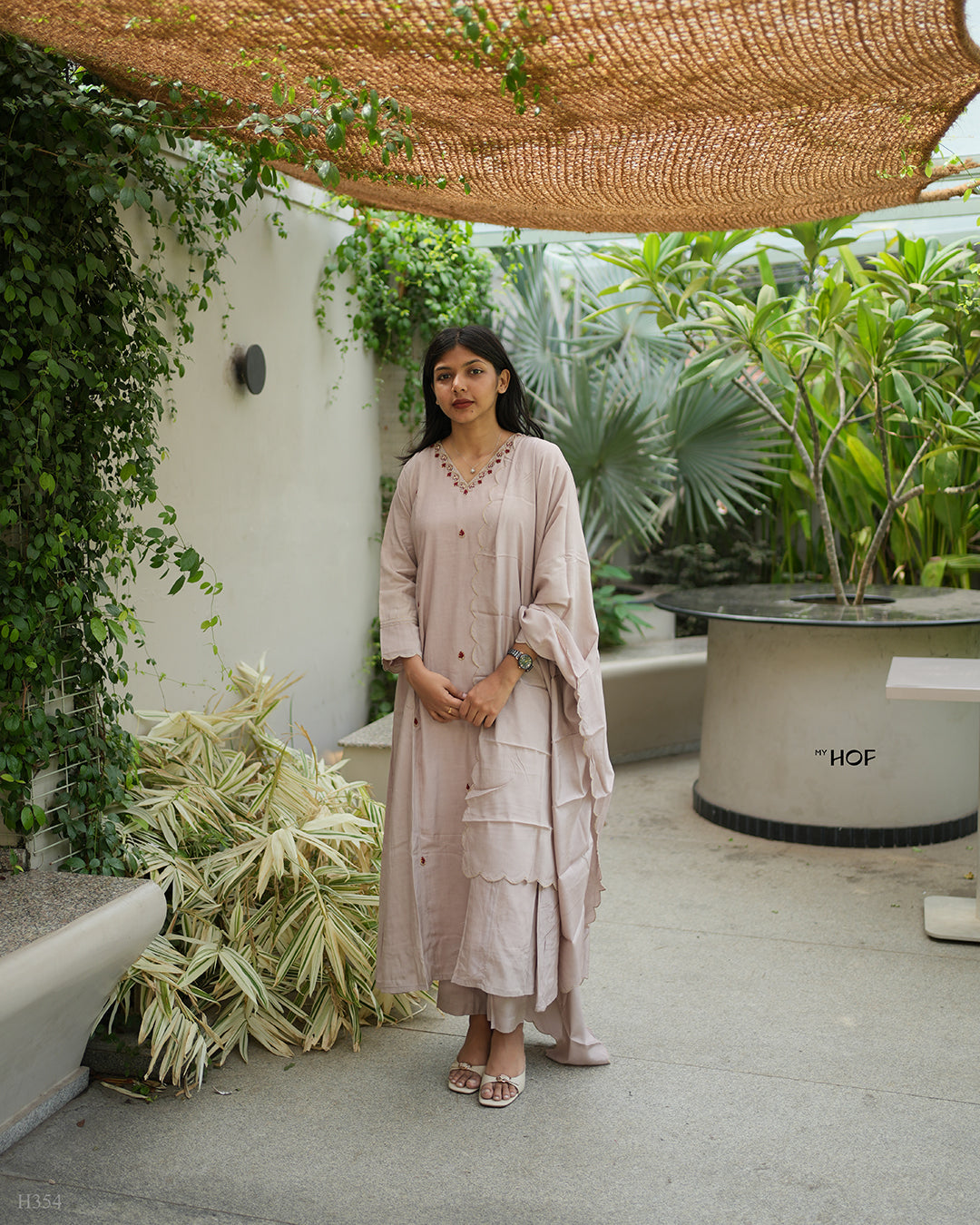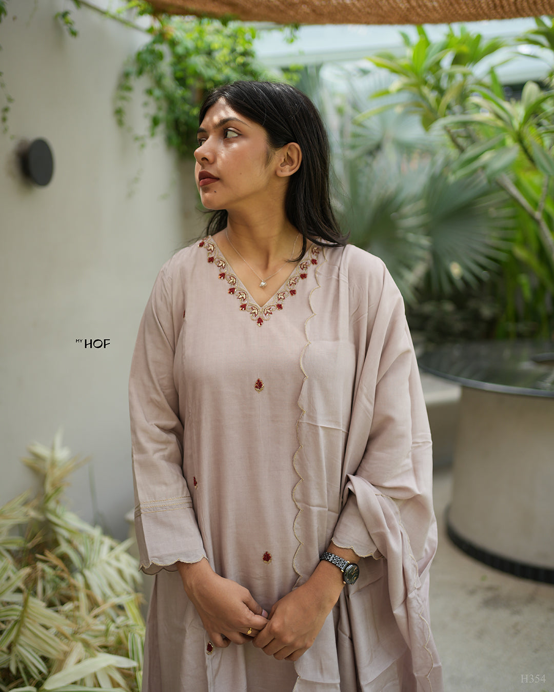 MyHof presents the Onion Pink Suit Set in Premium Muslin Fabric! ✨ Featuring a flared top adorned with delicate red floral hand embroidery, this ensemble exudes timeless charm. Paired with a scalloped muslin dupatta and bottom, it’s the perfect blend of elegance and sophistication!