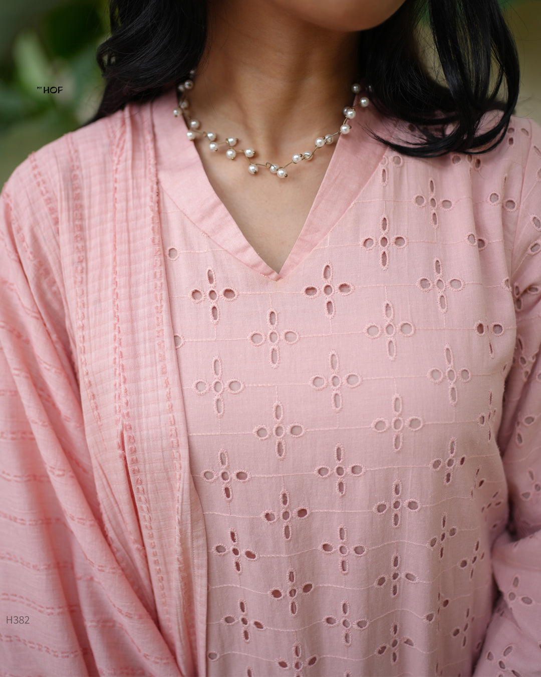 MY HOF is launching a pastel pink suit set in premium cotton Hakoba, featuring a slitted top with delicate floral embroidery thread work and a graceful V-neck design. The scalloped sleeves add a refined touch, while the mul cotton butta dupatta with green thread work completes the look with elegance.
