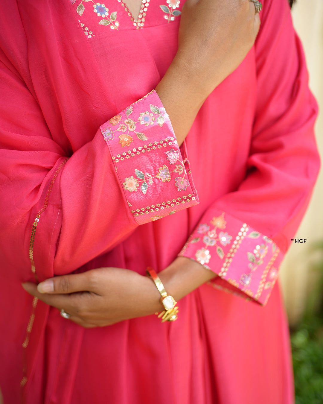 MY HOF Launching Pink Suit Set In Muslin And The top has a flared Anarkali style design with a V-neckline adorned with fine thread and embroidery on the neckline and sleeve edges. It comes with matching straight-fit pants for a refined comfortable fit. The look is completed with a Organza dupatta enhanced with tiny sequins.