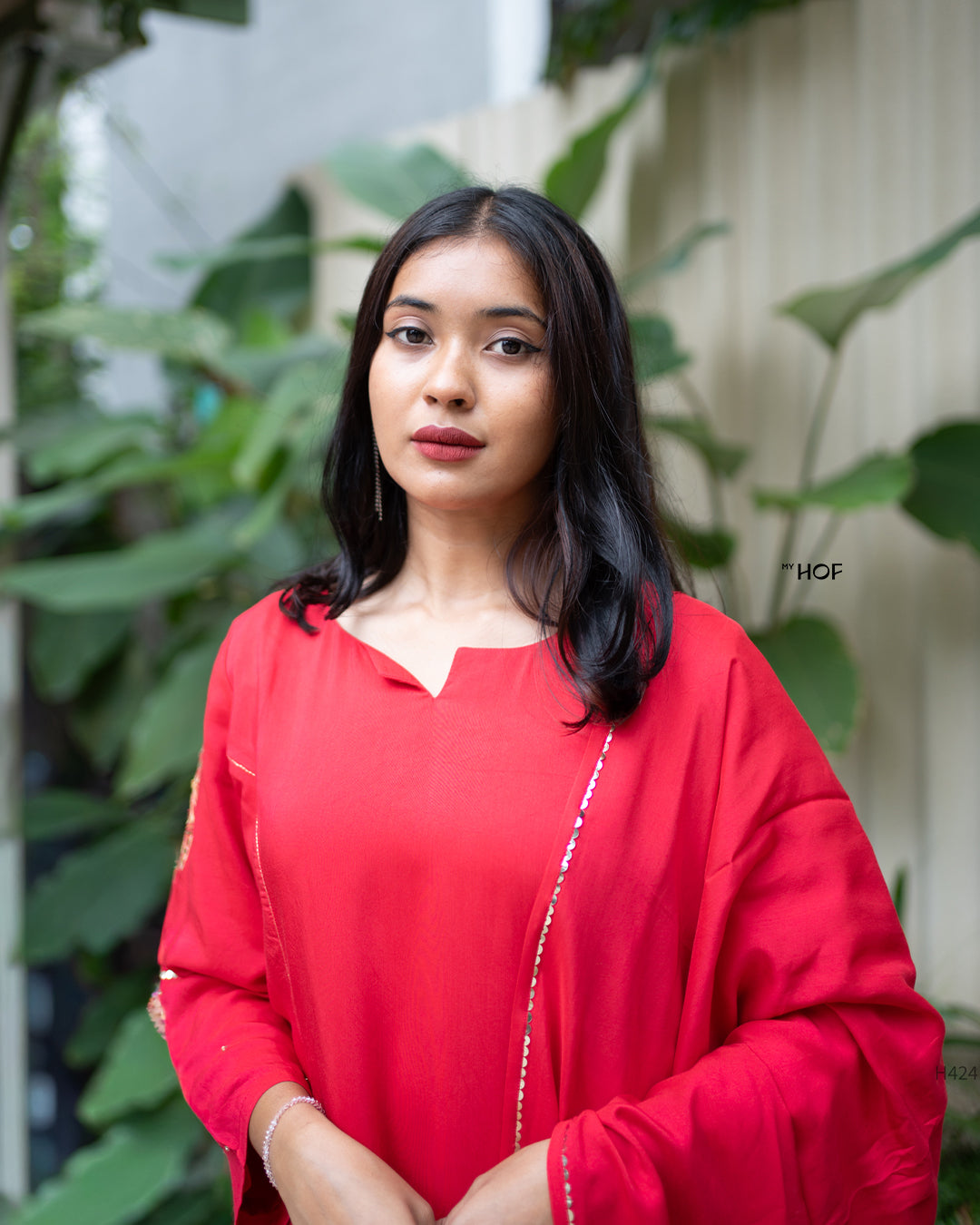 MY HOF Rani Red Suit Set With Hand Embroidery In Muslin