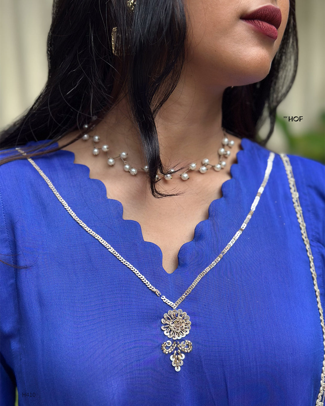MY HOF Launching Royal Blue suit set in Muslin. It features subtle golden thread embroidery along the neckline, sleeves and hem adding a refined touch. The V-neck design and scalloped edges give it a simple yet elegant look and dupatta is finished with delicate golden thread detailing along the borders.