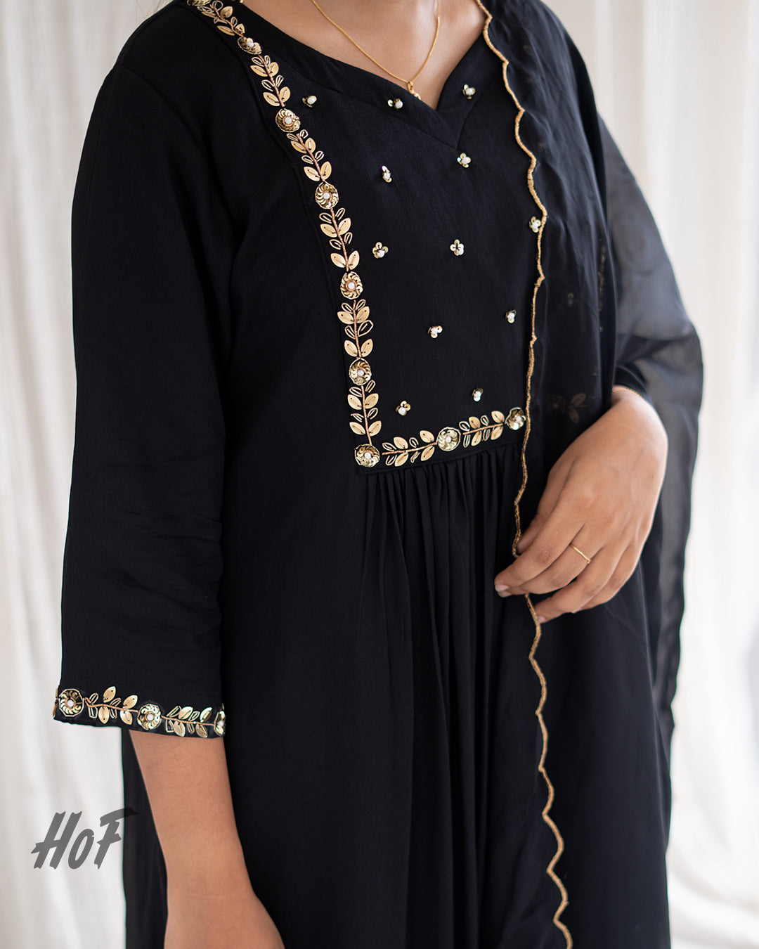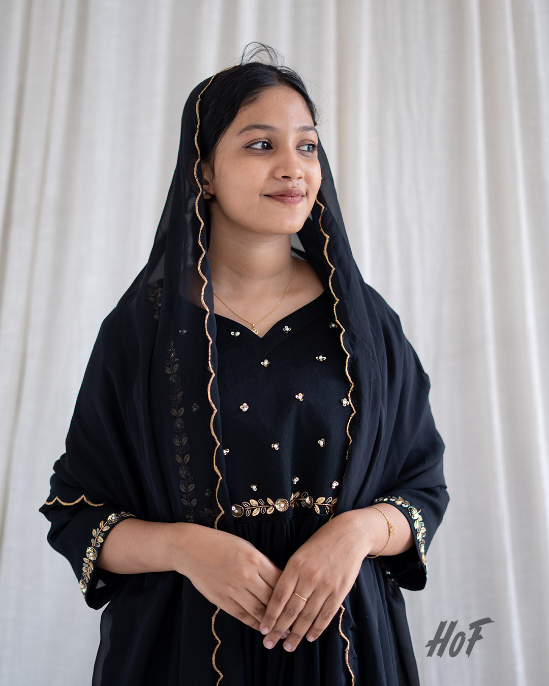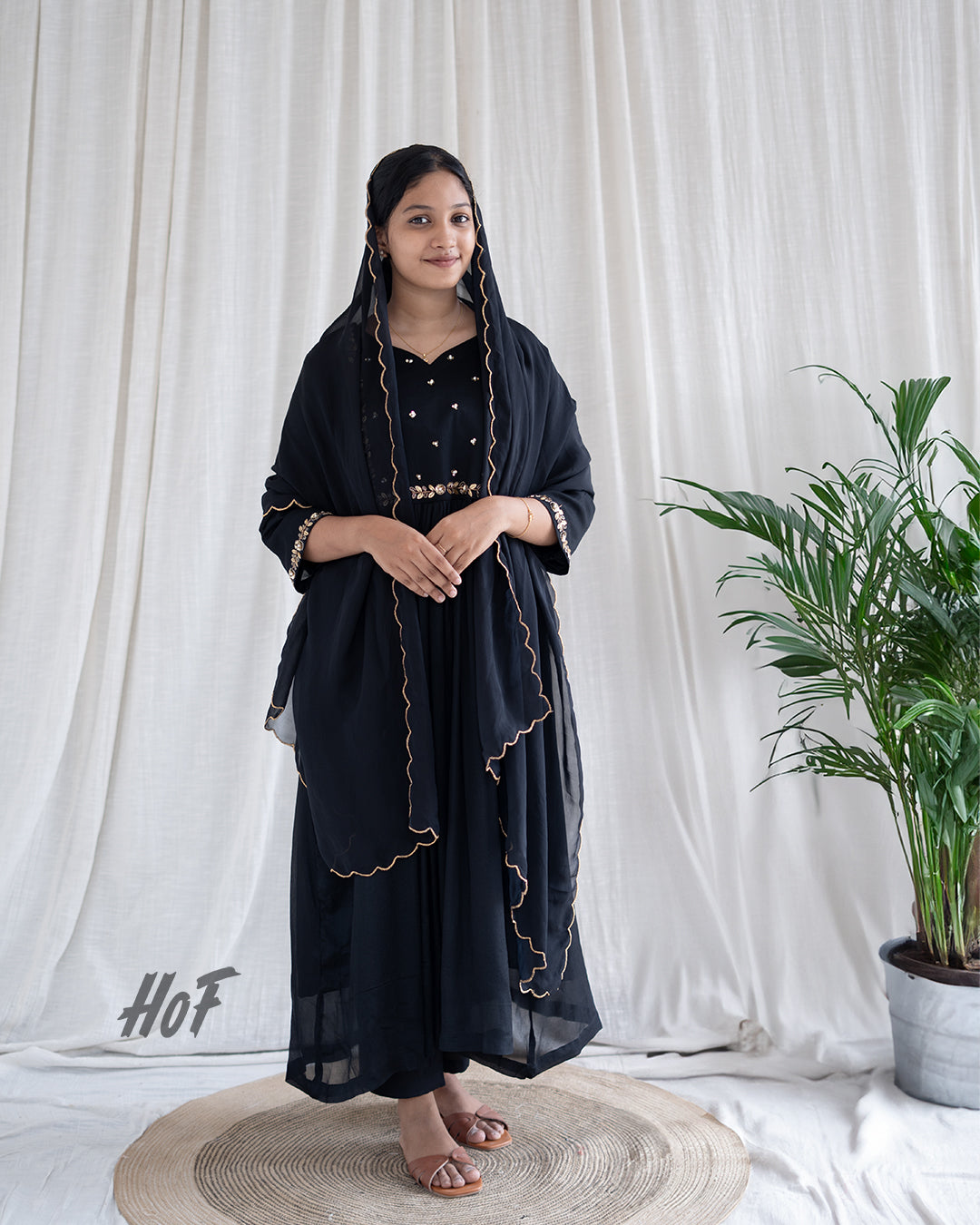 Unveiling elegance in every stitch! MyHof introduces the alluring black muslin fabric suit set. Adorned with exquisite embroidery on the neckline and sleeves, this ensemble exudes sophistication. Its semi-flared long top and scalloped dupatta add a touch of grace to your attire. Elevate your style with this timeless ensemble. Shop now!