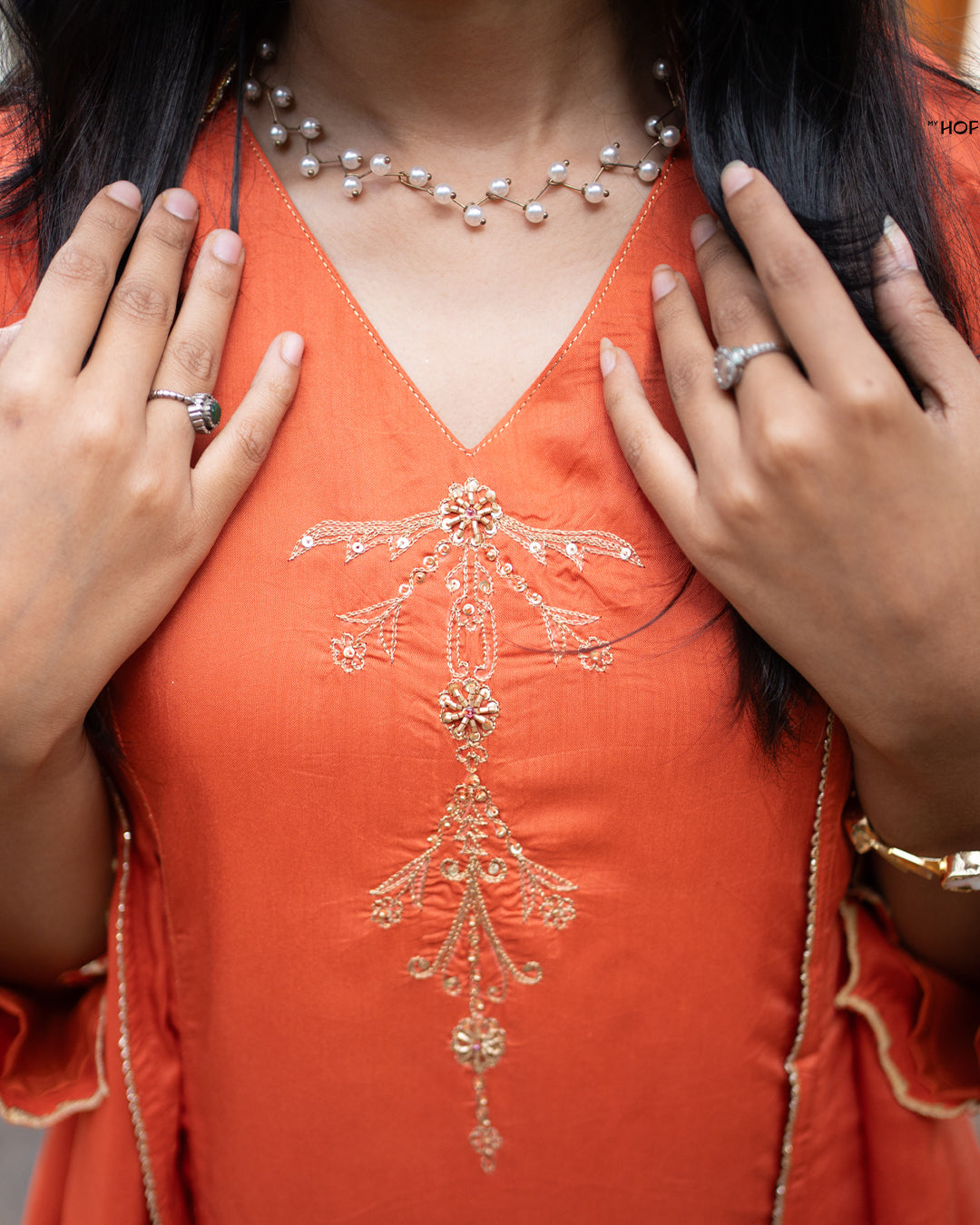 MY HOF Launching This Brick orange suit set in Muslin and featuring a straight-cut kurta with a V-neckline and full sleeves. The top is adorned with delicate golden thread and sequin embroidery near the neckline adding a touch of elegance. It comes paired with matching straight pants and a flowy dupatta detailed with fine golden lace.