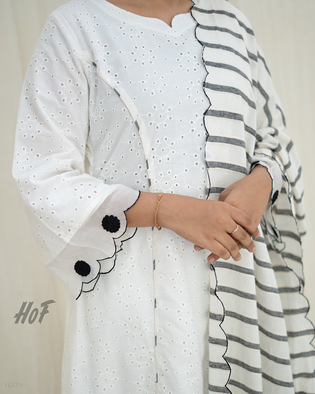 MyHof White Suit Set With Black Stripped Dupatta In Cotton Hakoba