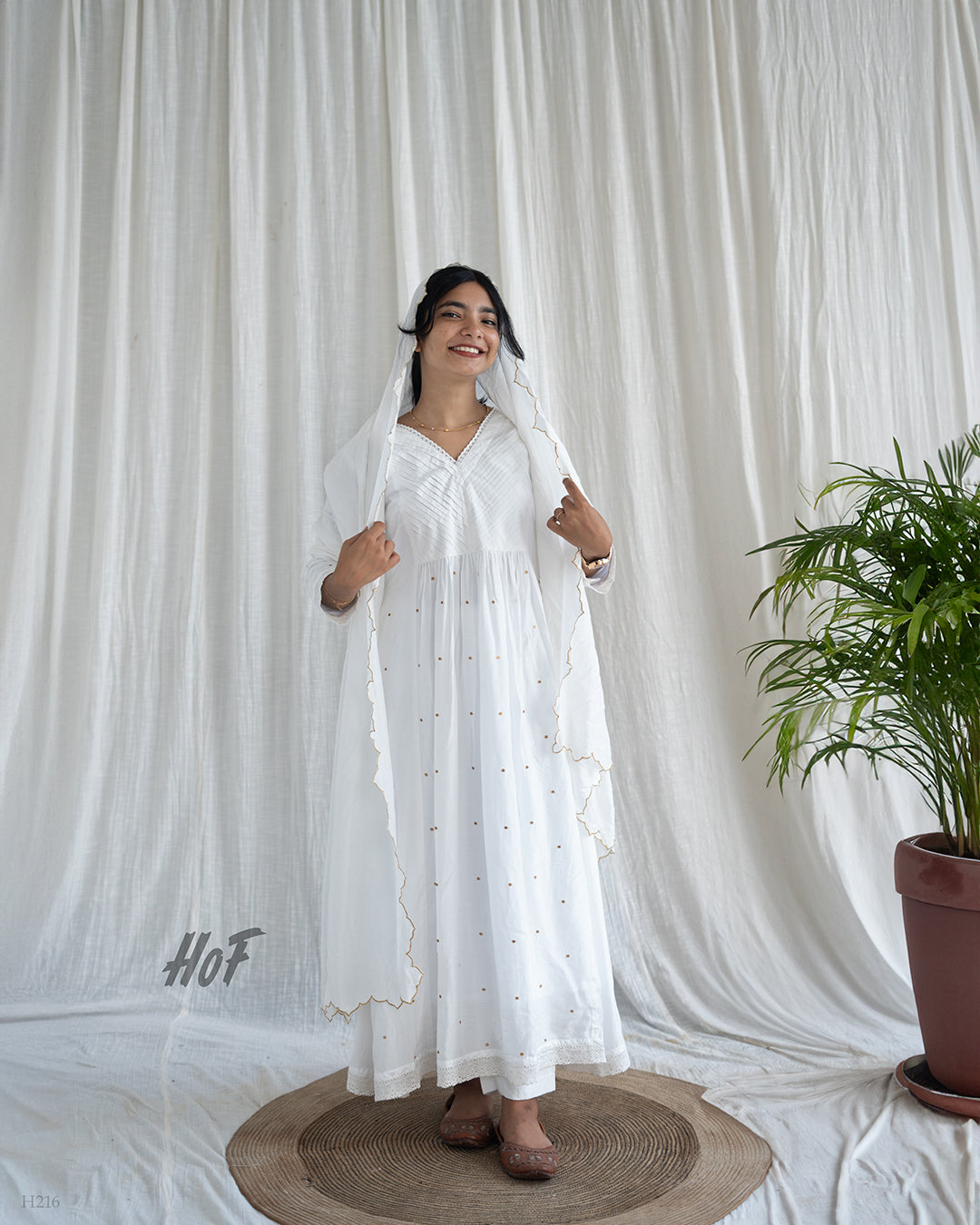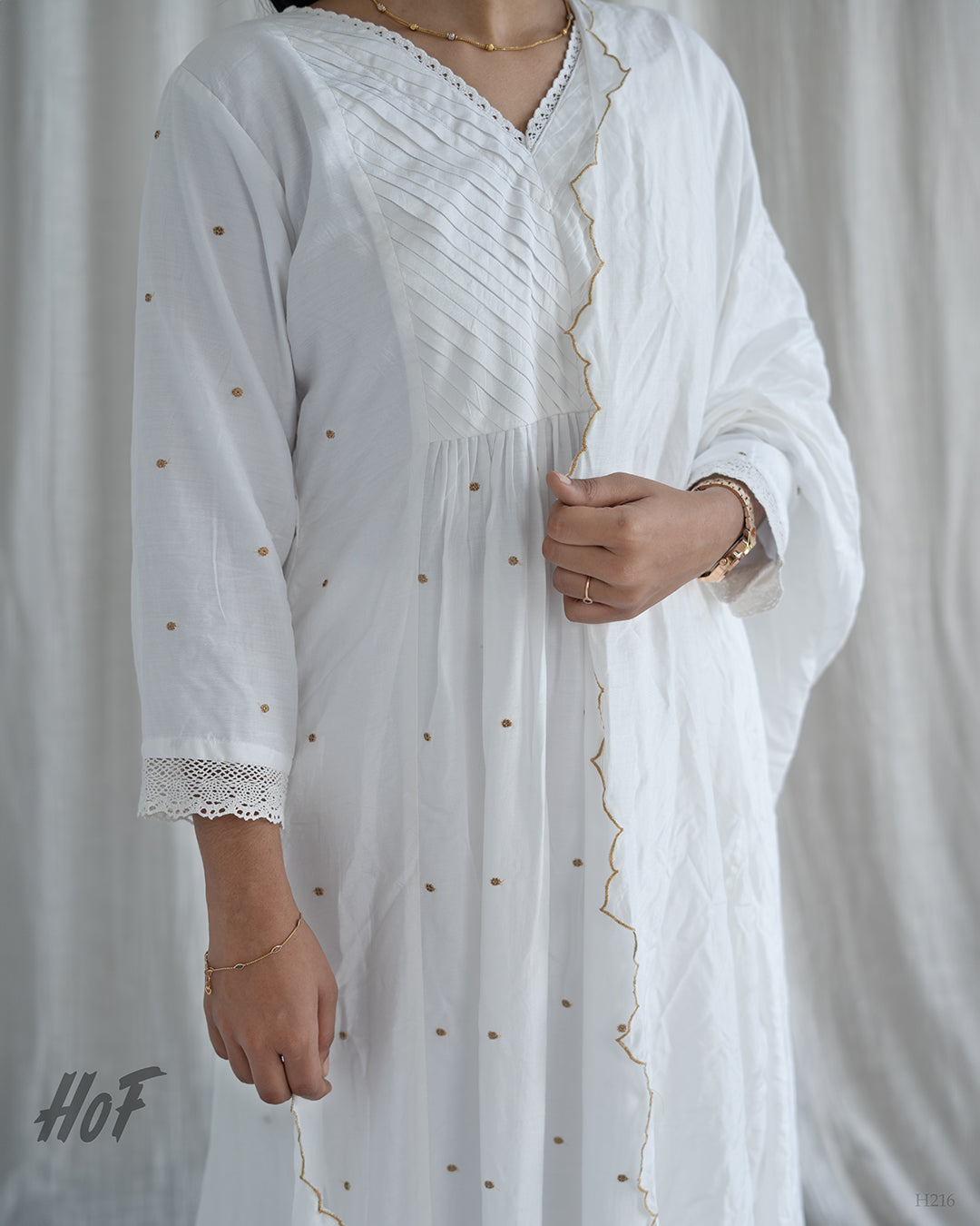 MyHof White Suit Set With Golden Thread Work In Muslin