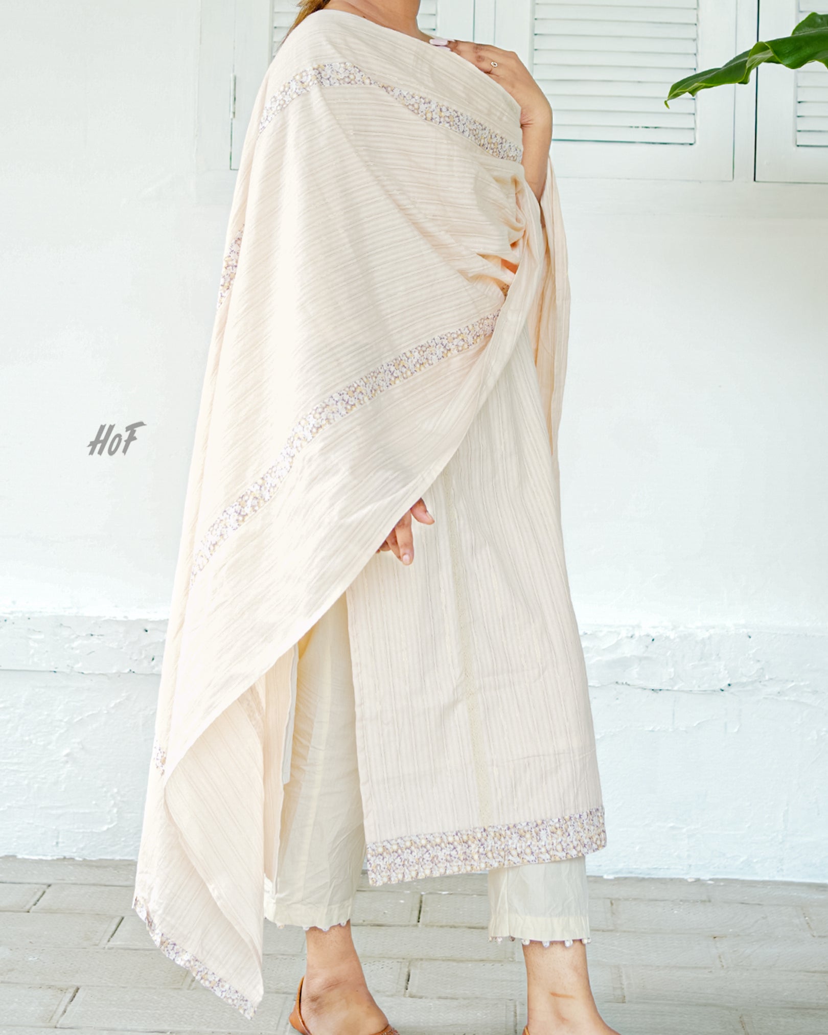 Get ready to embrace pure sophistication and comfort with our latest launch - the Off-White Cotton Suit Set! Crafted with love and care, this exquisite ensemble exudes grace and charm, perfect for every woman who cherishes timeless fashion.