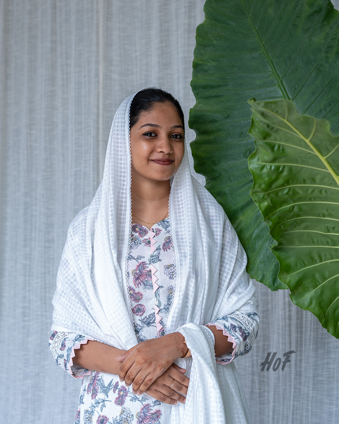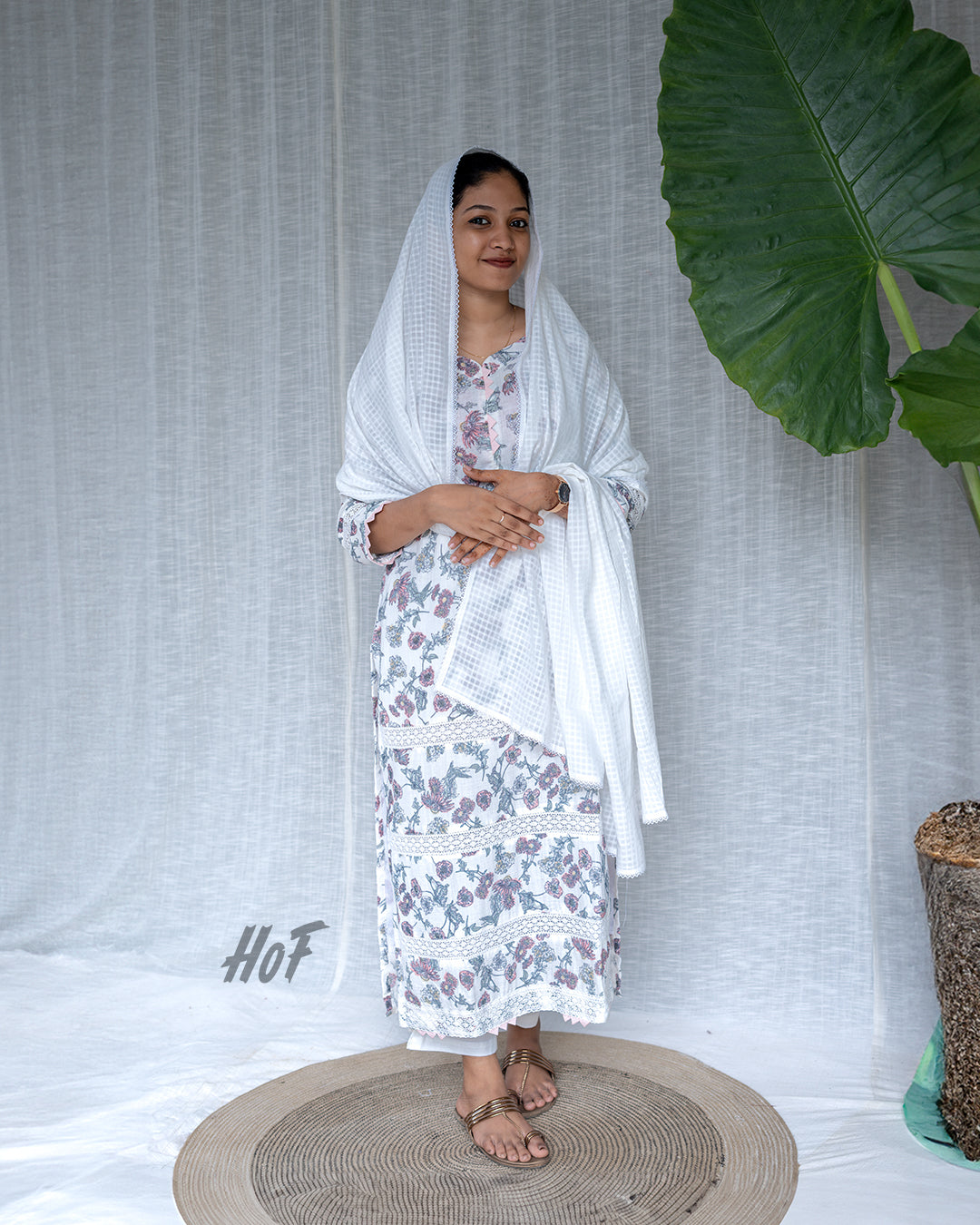 This Printed White Cotton Suit Set boasts a full set of a white cotton fabric and delicate floral print. It's highlighted with beautiful lace work for a timeless, classic look. Feel confident and comfortable in elegance that never goes out of style.